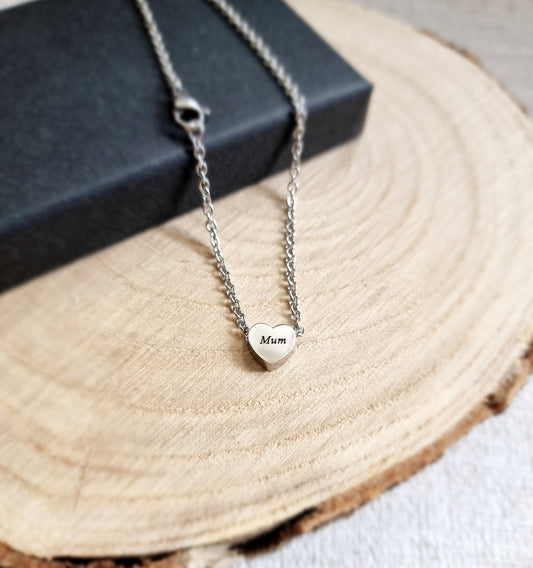 Stainless steel Silver Necklace, Engraved Mum heart bead pendant, Mother's Day gift jewellery, Cable chain for women